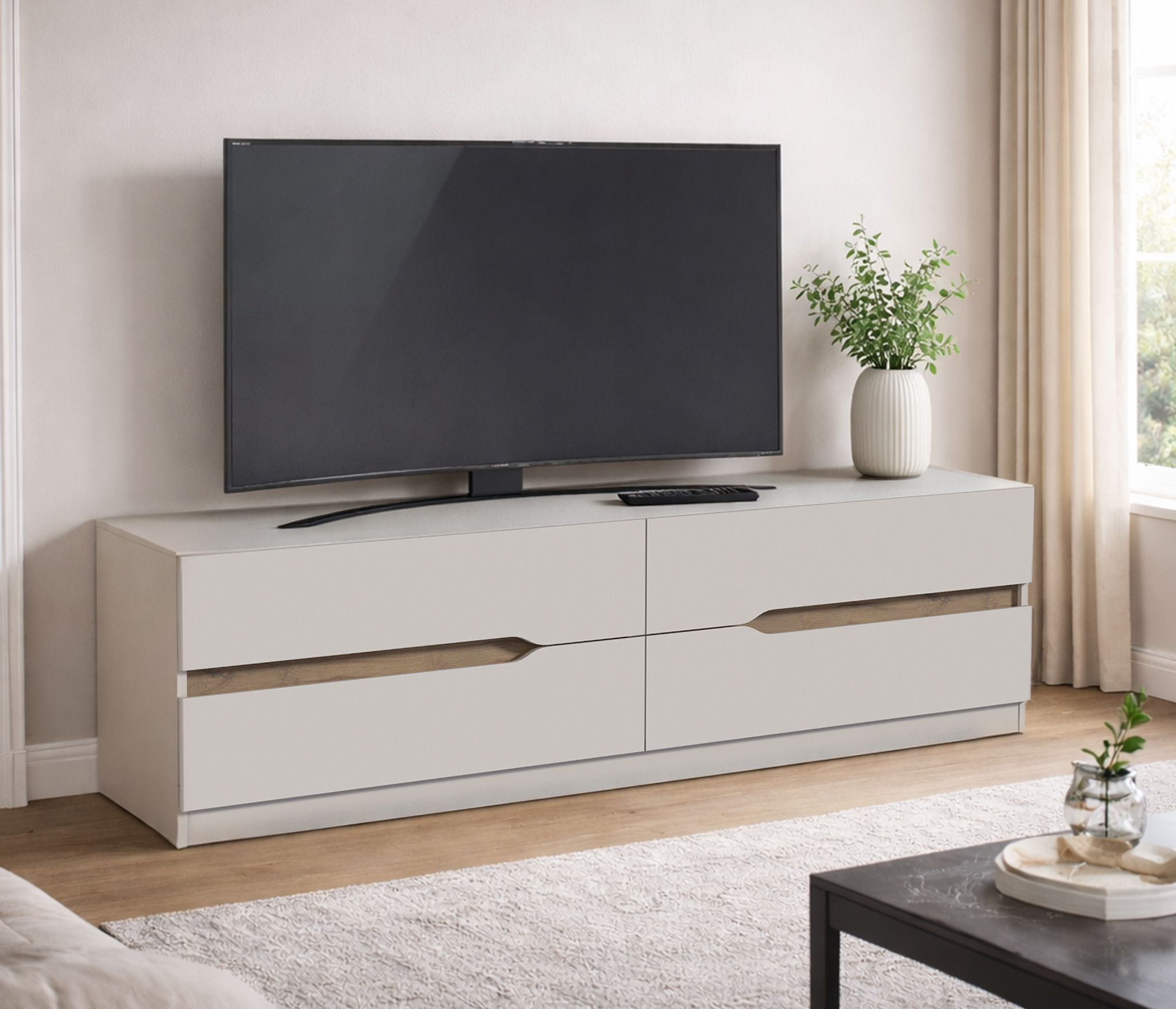 - Подвесная тумба под телевизор монтируется на стену и не касается пола. Она визуально делает пространство легче и упрощает уборку — под ней легко проехать пылесосу.
