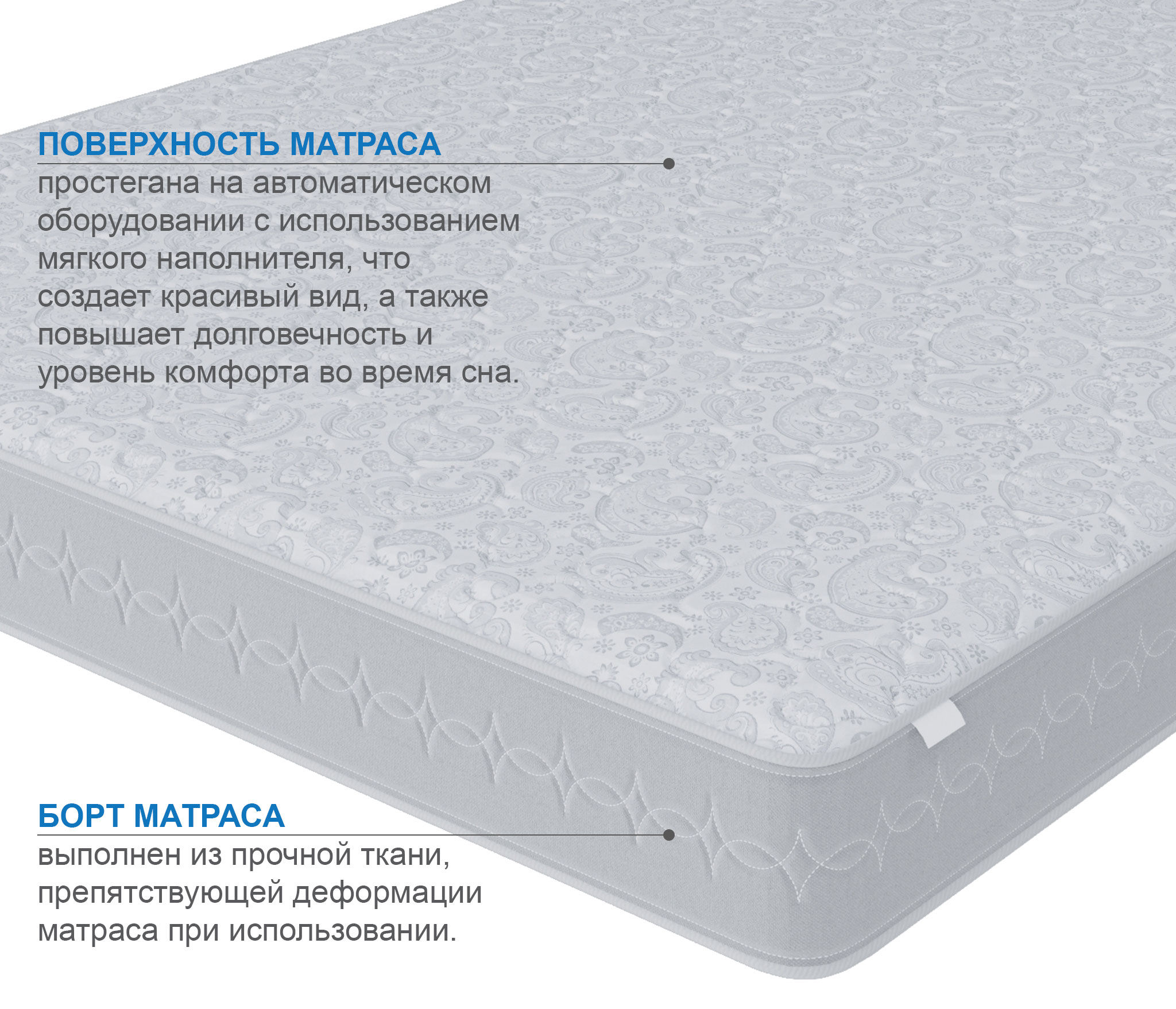 Наполнитель: вязкоэластичный ППУ, сизаль 10 мм, латексированная кокосовая плита 10 мм, термовойлок, латексированная кокосовая плита 20 мм, ячеистая пена с эффектом микромассажа.