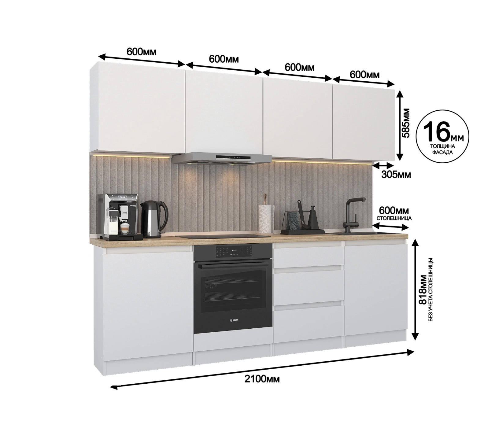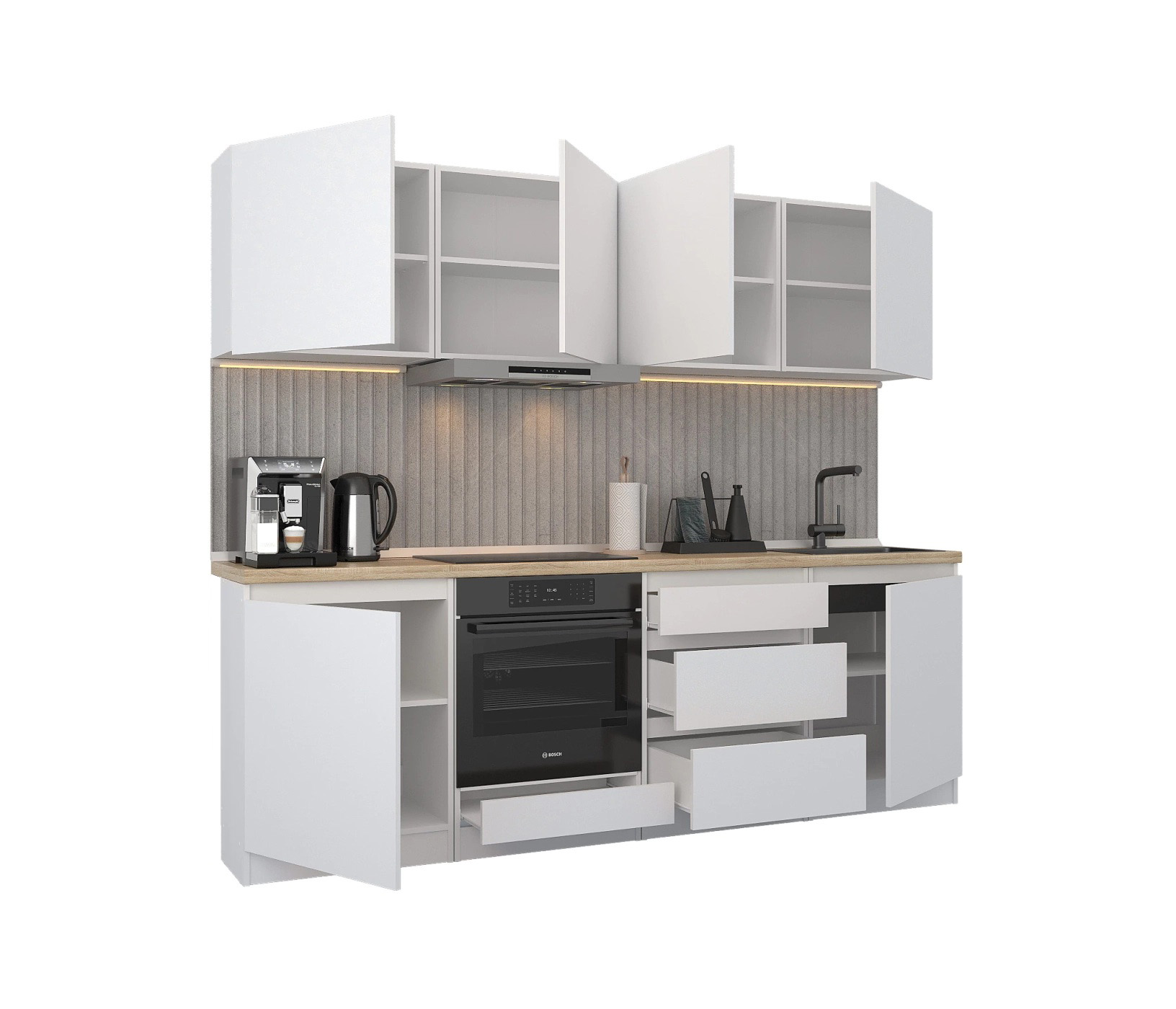 Кухня Леон сочетает в себе функциональность, стиль и доступность, и является прекрасным выбором для тех, кто ищет компактное и удобное решение для своей кухни. Кухонный гарнитур Леон идеально подходит для помещений с ограниченным пространством. Корпус и фасады выполнены из белого ЛДСП. Фасады столов и шкафов не имеют лицевой фурнитуры и открываются захватом за тыльный край фасада. Леон смотрится современно, а отсутствие ручек упрощает уход за поверхностью.