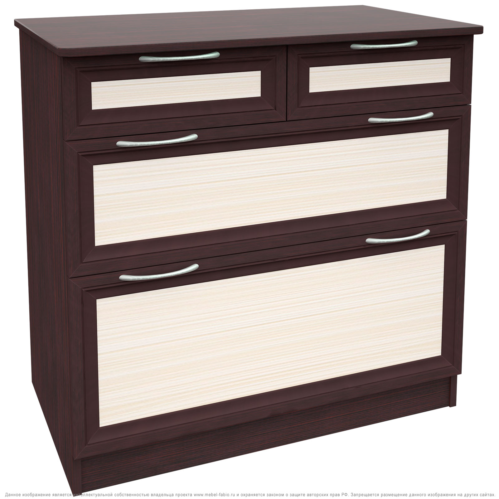 Комод 10 разработан для размещения в нём вещей разной габаритности.Для этого он оснащён 2-мя маленькими выдвижными ящиками.Далее по возврастанию,нижний ящик больше предидущего.Корпус ЛДСП,фасады рамочные МДФ.Производитель оставляет за собой право менять фурнитуру