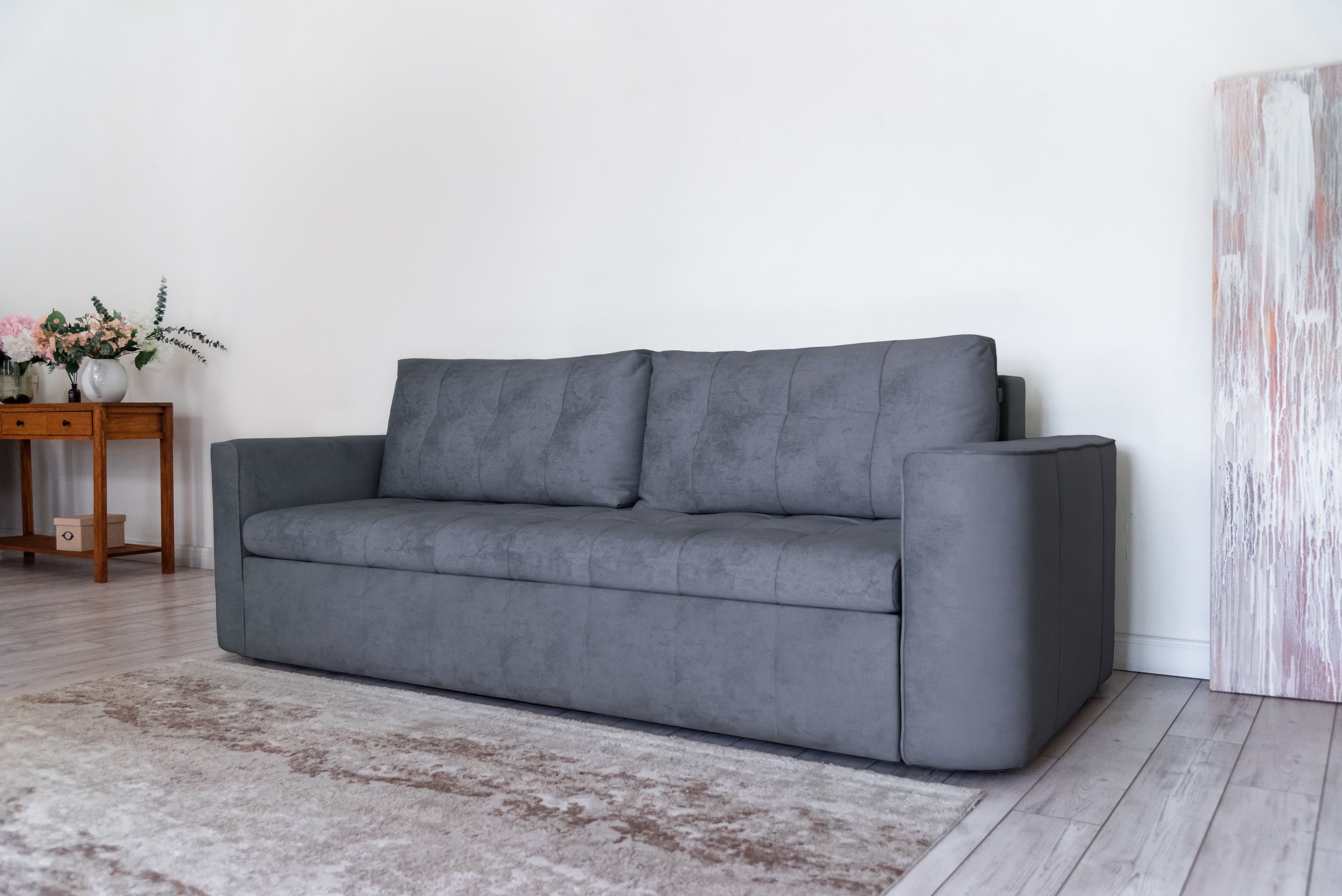 Стильный прямой диван BOSTON создан для тех, кому важна практичность и комфорт: надежный металлокаркас, мягкие ткани и быстрая трансформация в спальное место! Спинка защищает от соприкосновения со стеной во время сна.