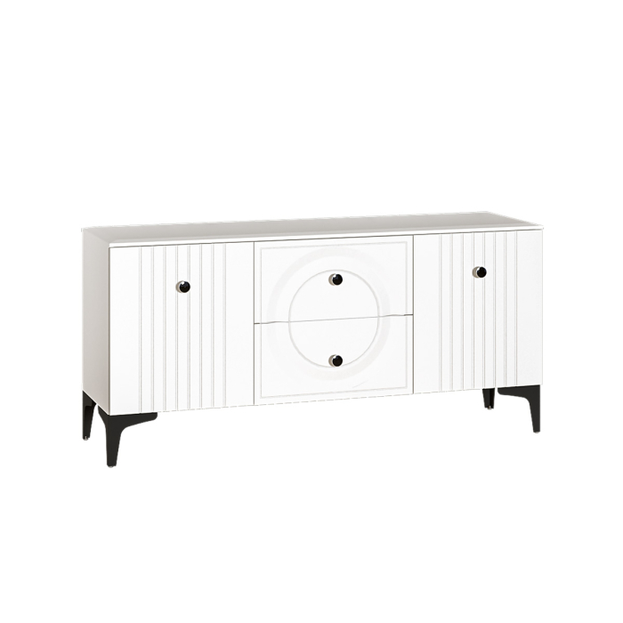 Тумба под ТВ Валенсия 16.45 оснащена двумя выдвижными ящиками по центру и нишами с полкой за распашными дверками по краям.