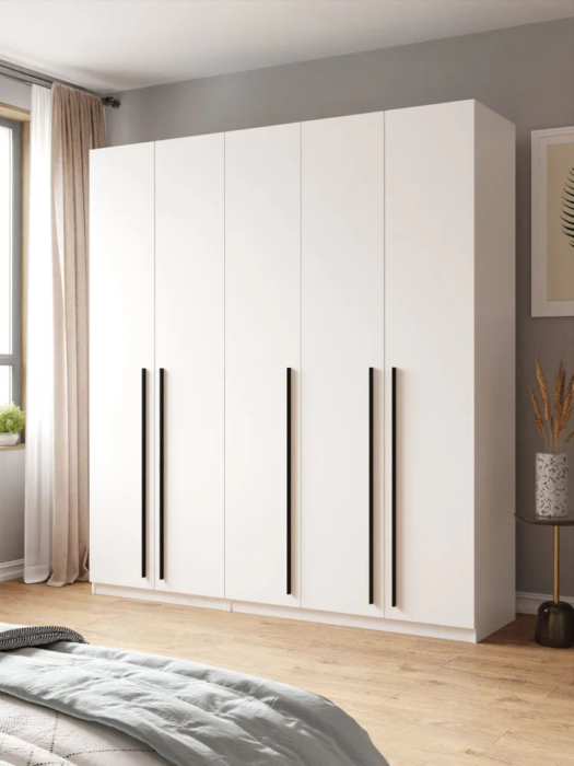 Этот шкаф подходит как для домашнего использования, так и для организации пространства в офисе или магазине благодаря своим стильным металлическим ручкам и эстетичному дизайну.