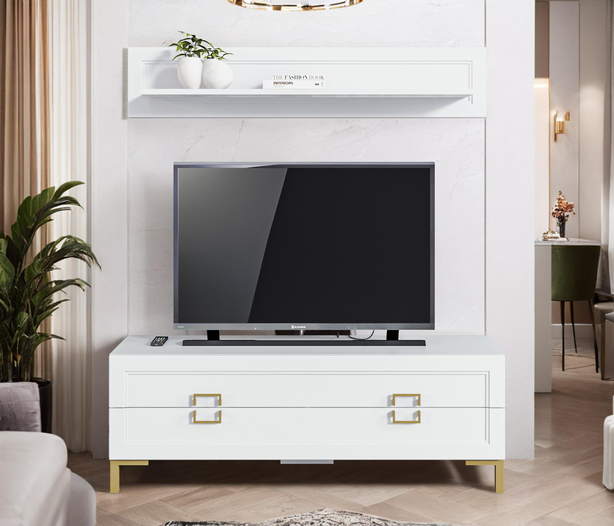 Комплект для гостиной, тумба ТВ и полка, Белый (Белый)