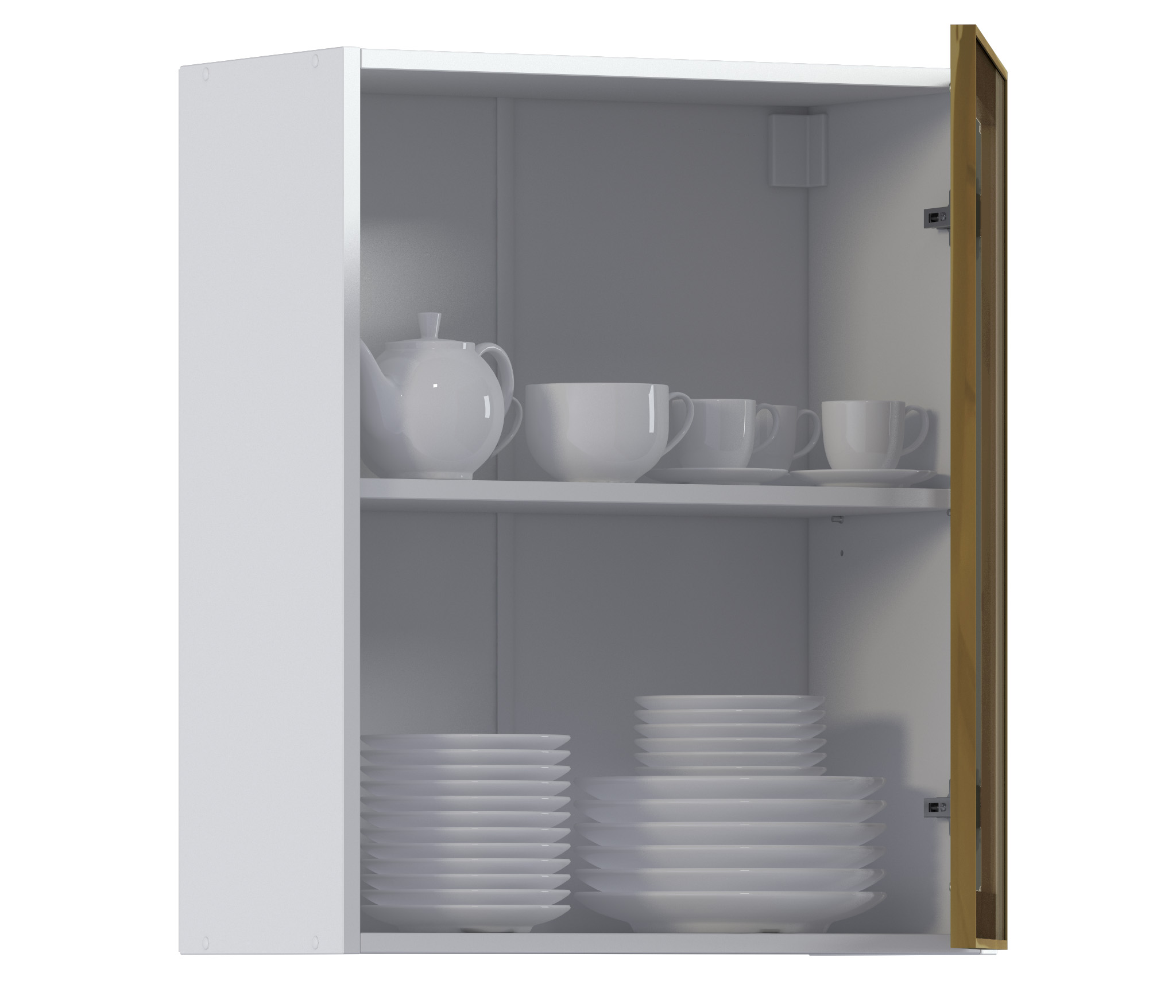 Комплект включает в себя корпус кухонной полки (белого цвета) с необходимой фурнитурой, фасад из алюминиевой рамки золотого цвета и бронзового стекла, а также ручку, соответствующую цвету рамки фасада.