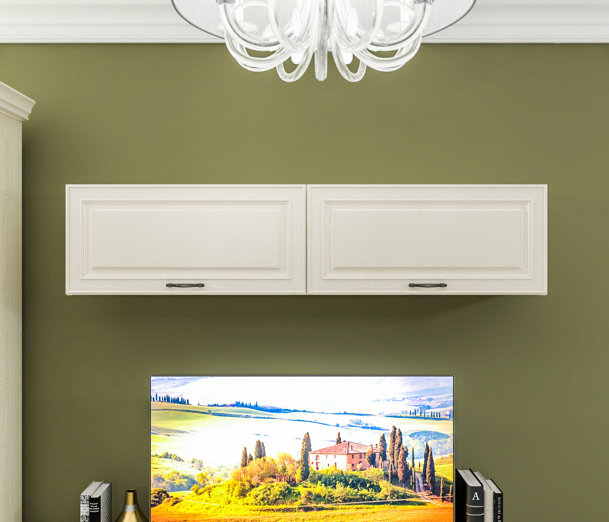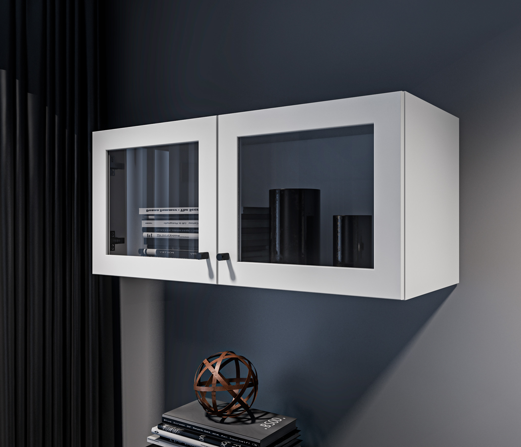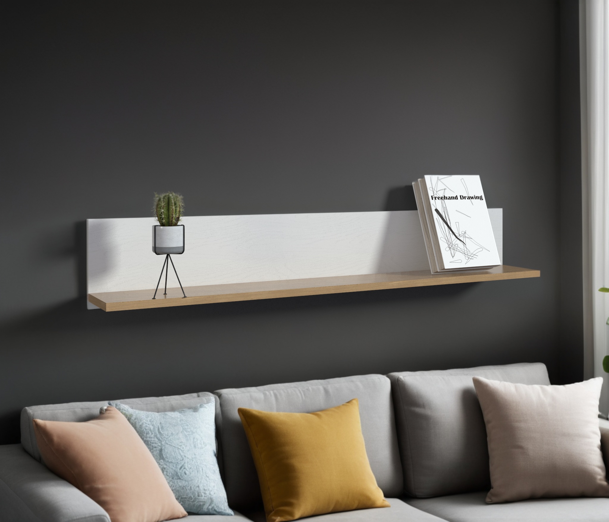 Особенностью данной модели являются плавные вырезы в фасадах, которые не только удобны для открывания, но и добавляют оригинальности. Внутри этих вырезов расположены вставки цвета Дуб вотан, что создает контраст и подчеркивает эстетику мебели.