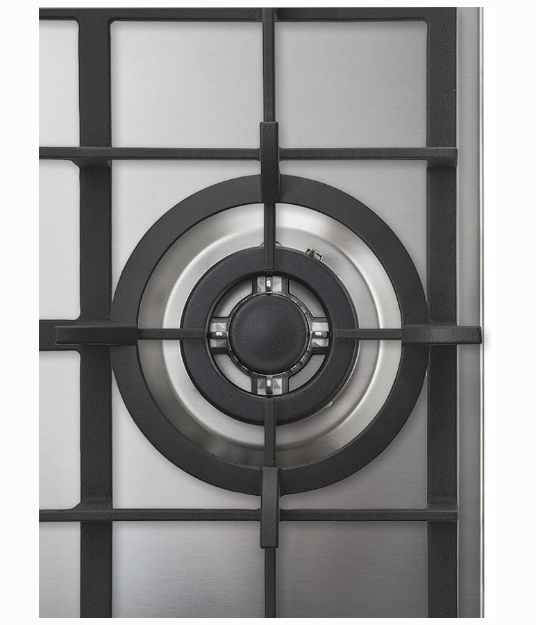 Газовая варочная панель 45см, 3 высокоэффективные конфорки, WOK- сверхмощная конфорка с тройным рядом пламени, автоматический электроподжиг, газ-контроль каждой конфорки, передние металлические переключатели, чугунные решетки, в комплекте - чугунная подставка WOK и адаптер для кофейника, цвет- нерж