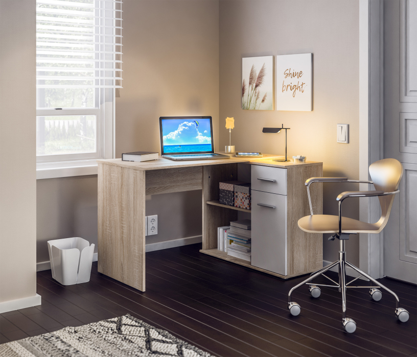 Стол-тумба Мамбо СБ-2886 – продуманное и комфортное рабочее место. Идеальный вариант, если есть необходимость в двух письменных столах. Простая конструкция, светлый оттенок, лаконичный угловой дизайн позволяют без проблем разместить стол-тумбу Мамбо в детской, комнате школьника или студента, а также в кабинете. Габаритные размеры – ширина 119 см, высота 74 см и глубина 91 см. Под рабочей поверхностью расположена тумба с открытыми вместительными полками, а также выдвижной ящик и закрытое отделение с отдельной дверцей. Стол произведен из современного экологичного КДСП. Корпус и рабочая поверхность выполнены в цвете «Дуб Сонома», фасадные поверхности в Белом цвете. Возможен как левый, так и правый вариант сборки.