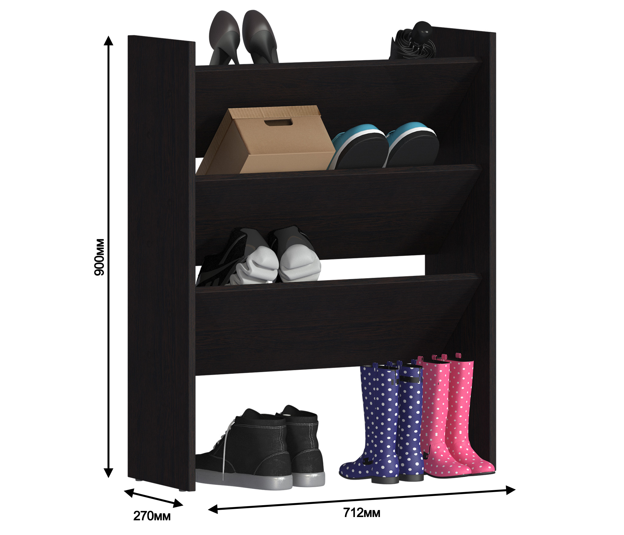Обувница Дельта СБ-2130 выполнена в минималистичном дизайне, оснащена тремя полками и впишется в интерьер небольшой прихожей. ¶Габаритные размеры – ширина 71 см, высота 90 см и глубина 27 см. Благодаря продуманной конструкции этот функциональный предмет мебели даст возможность аккуратно хранить до 12 пар обуви. На открытых полках обувь всегда будет быстро высыхать и проветриваться. ¶Обувница выполнена в цвете «Венге» из экологичного современного КДСП.