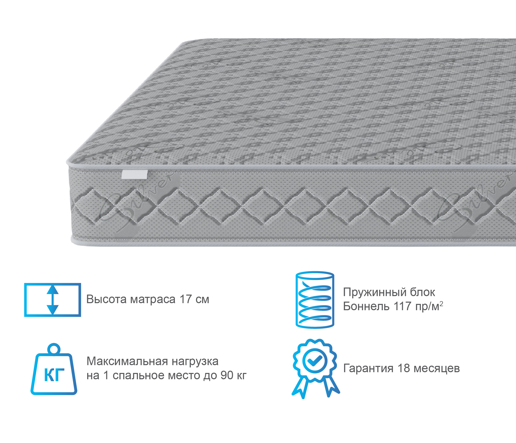 Односпальный матрас дополнен чехлом, изготовленным из ткани синтетический жаккард, стеганный на синтепоне 200 г/м2. Это современное и очень прочное полотно.