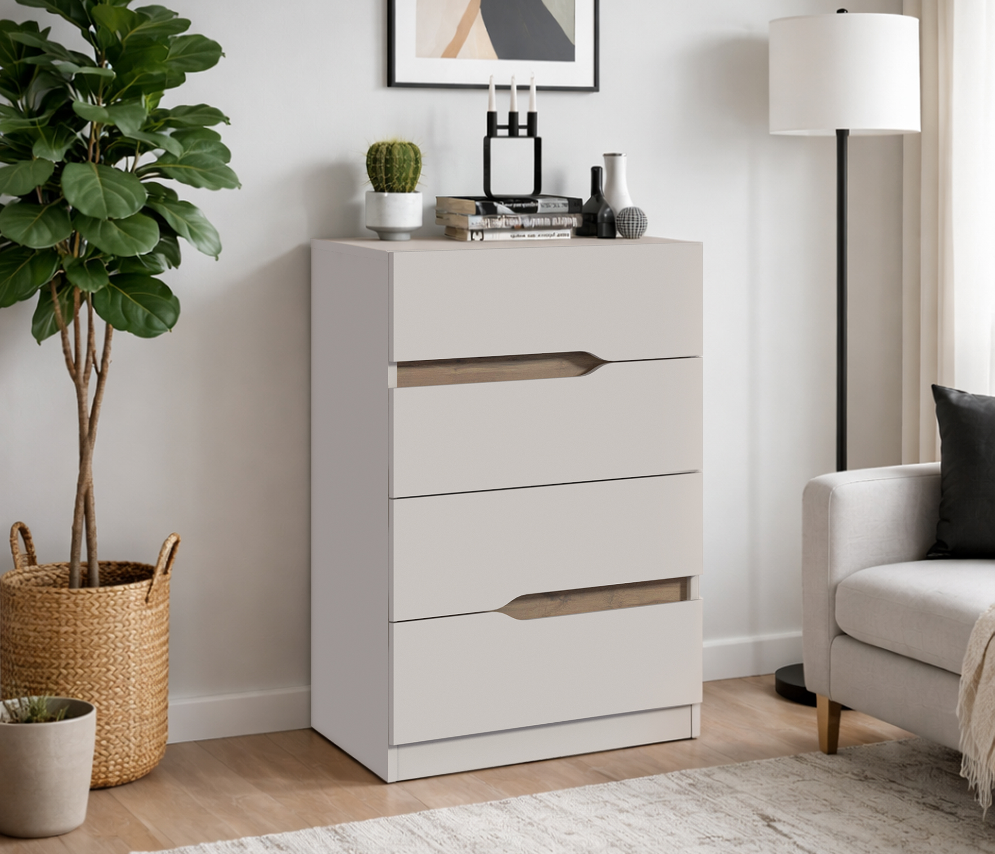 Выполнен комод Мамбо из современного материала. Основной цвет отделки -- «Дуб Сонома», а фасады выдвижных ящиков имеют белое матовое покрытие.
