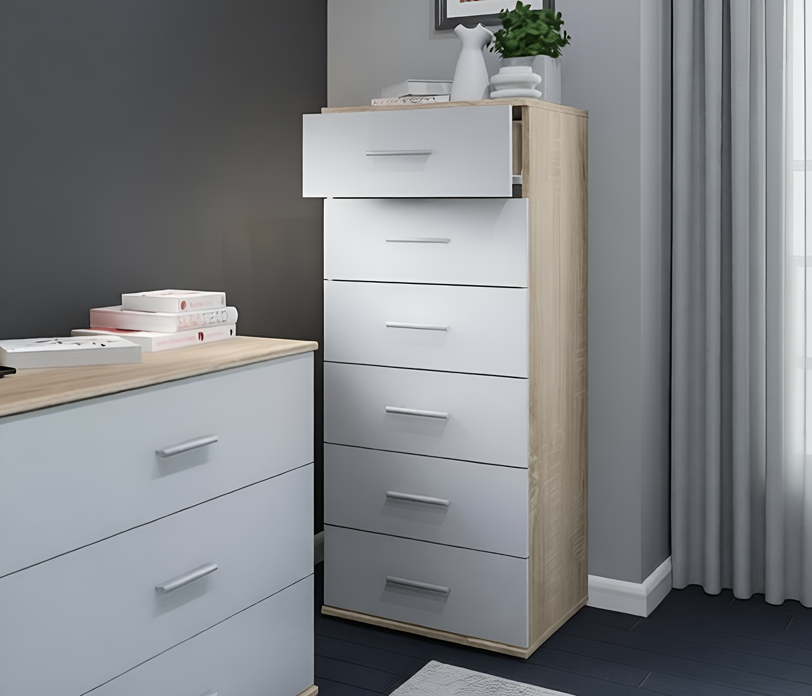Выполнен комод Мамбо из современного материала. Основной цвет отделки -- «Дуб Сонома», а фасады выдвижных ящиков имеют белое матовое покрытие.
