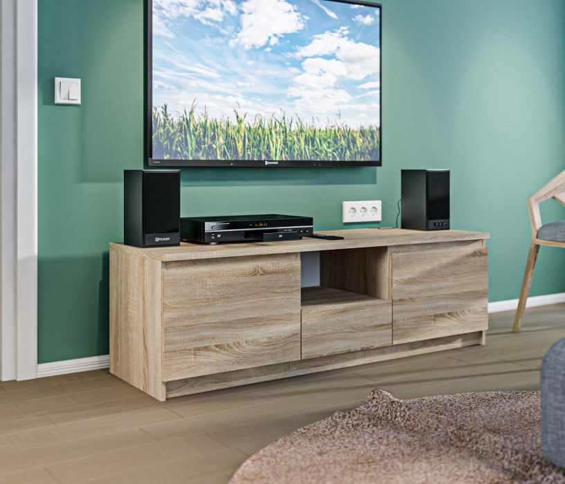 Габаритные размеры – ширина 140 см, высота 44 см и глубина 44 см. Вес тумбы 33,92 кг, что даёт возможность передвигать её по усмотрению. Визуально тумбу можно разделить на три отделения. В центре над выдвижным ящиком расположена открытая полка. По бокам два вместительных отделения за отдельными дверцами. Отличительной особенностью тумбы является отсутствие ручек, которые интегрированы в фасады. ¶Тумба выполнена в лаконичном дизайне из экологичного современного ЛДСП. Материал отделки устойчив к влаге и воздействию бытовых чистящих средств, что актуально для светлых поверхностей.