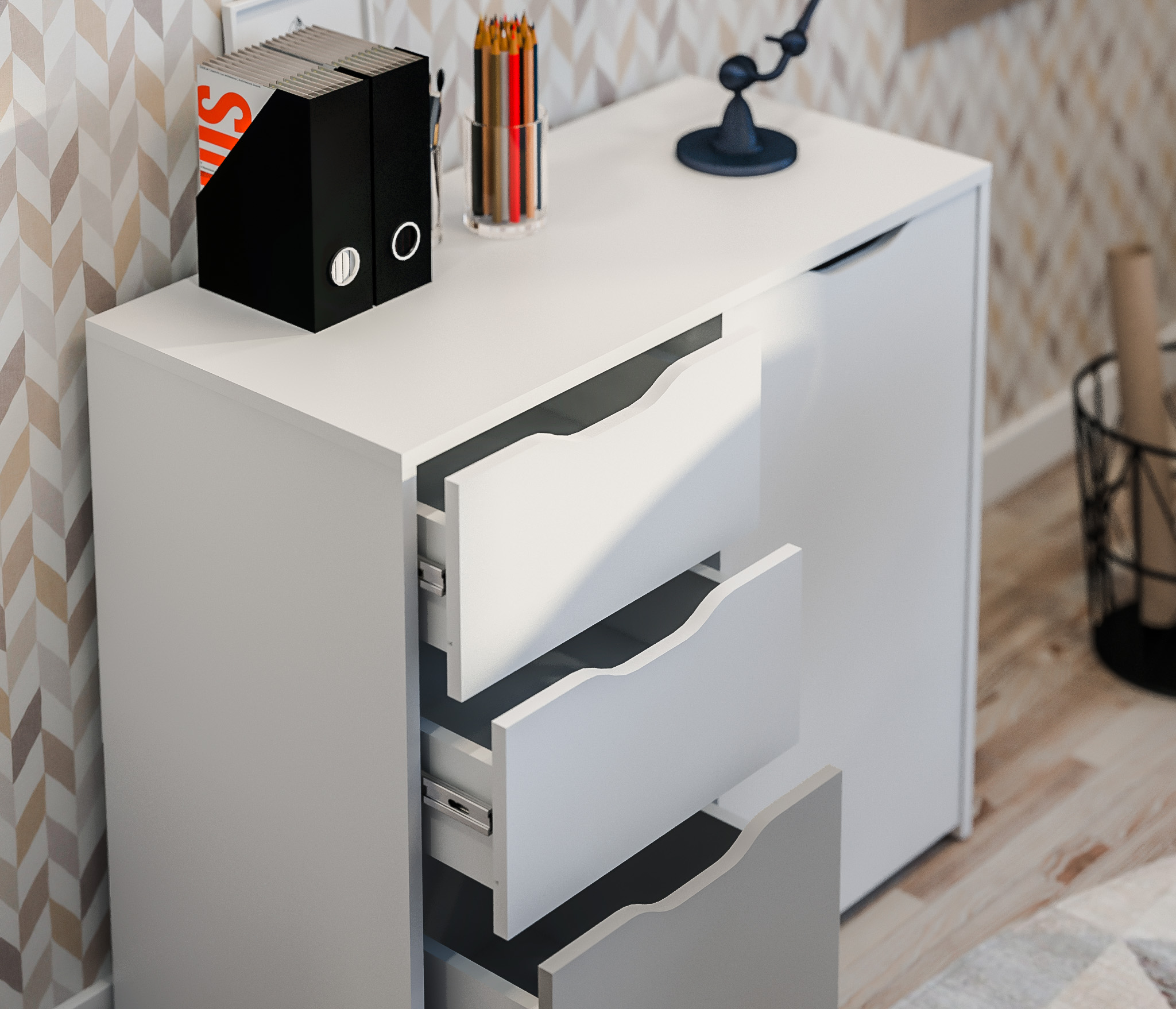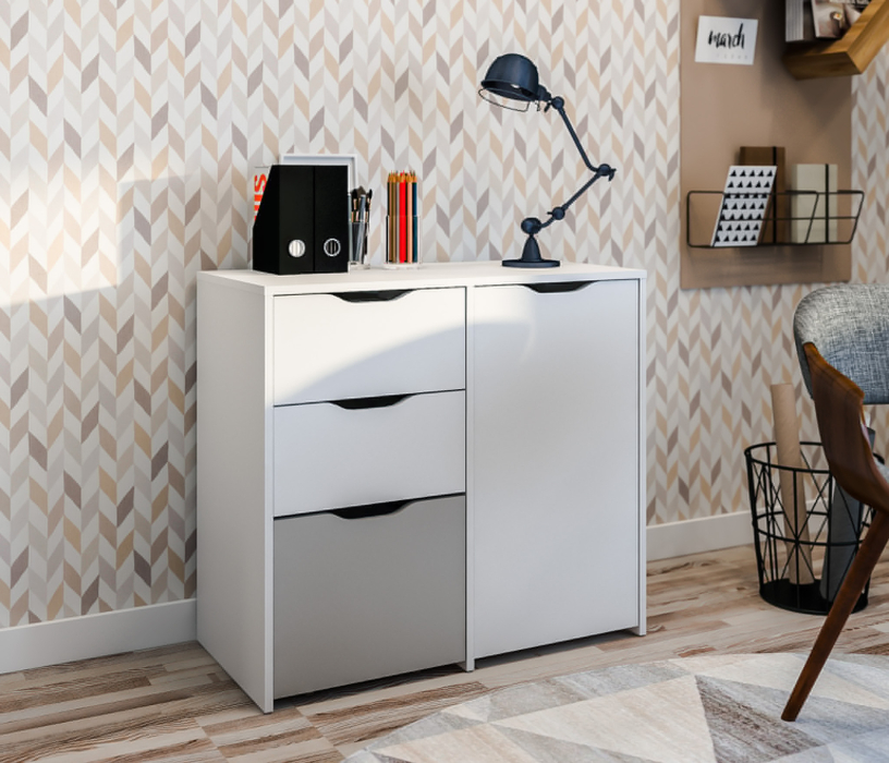 Комод Mika / Мика СБ-3282 – компактное и универсальное место хранения. Комод выполнен в современном сканди дизайне и является элементом модульного гарнитура Мика. Серия разработана для детских комнат или комнат подростков, хотя такой комод будет органичным и в офисе, и в кабинете. Габаритные размеры – ширина 85 см, высота 76 сам, глубина 40 см. Визуально комод можно разделить на две половины. Под одной дверцей расположено отделение с двумя полками. Другая половина оснащена двумя выдвижными ящиками и одним большим выдвижным ящиком на колесиках. Материал корпуса – ЛДСП с отделкой в цвете «Белый Альпийский». Фасады также из ЛДСП с комбинированной отделкой в цветах «Белый Альпийский» и «Серый перламутровый».