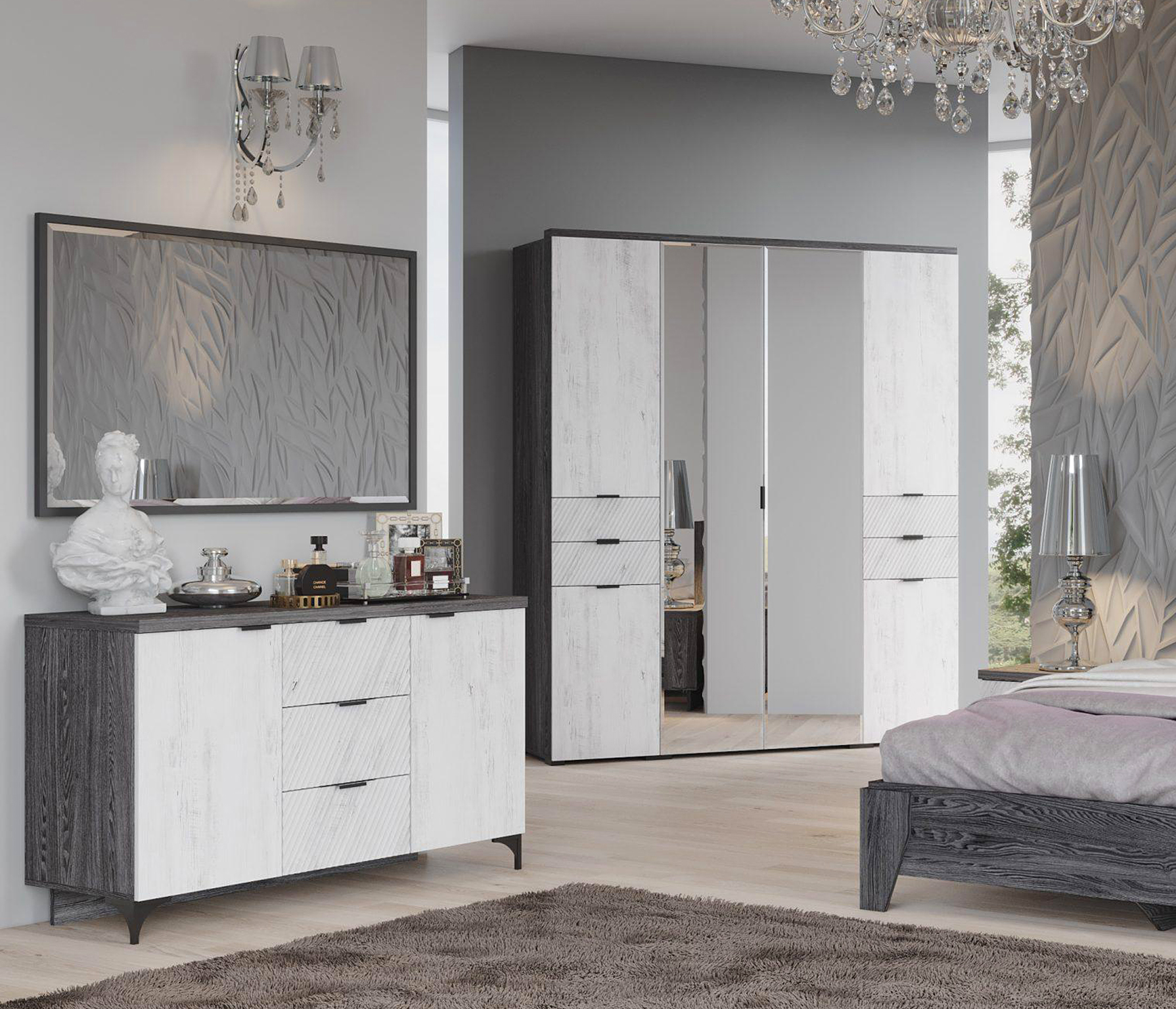 Новые современные цвета: черный ясень — это глубокий серый, легкий и одновременно динамичный цвет в сочетании с санторини белым — цвет с древесными линиями, создающими гармоничный контраст, наполняя пространство воздухом и природной энергией.