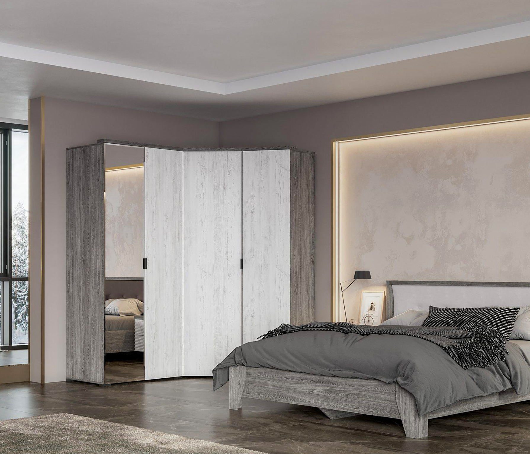 Новые современные цвета: черный ясень — это глубокий серый, легкий и одновременно динамичный цвет в сочетании с санторини белым — цвет с древесными линиями, создающими гармоничный контраст, наполняя пространство воздухом и природной энергией.