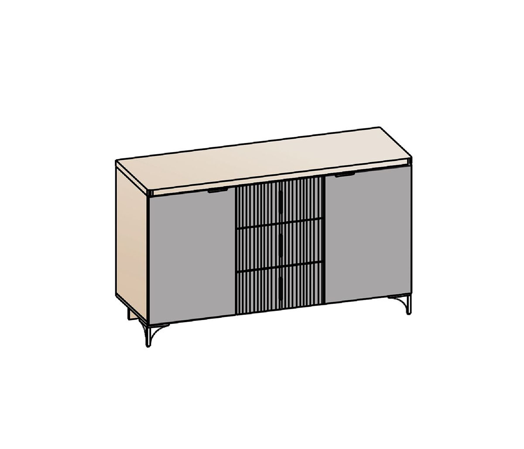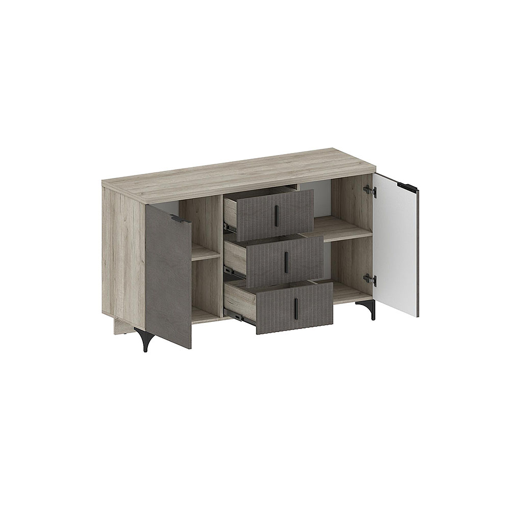 Прямой комод-тумба имеет две двери (две глухих), три выдвижных ящика с использованием механизма полного выдвижения и плавного закрывания, дно ящика выполнено из ЛДВП в цвет корпуса