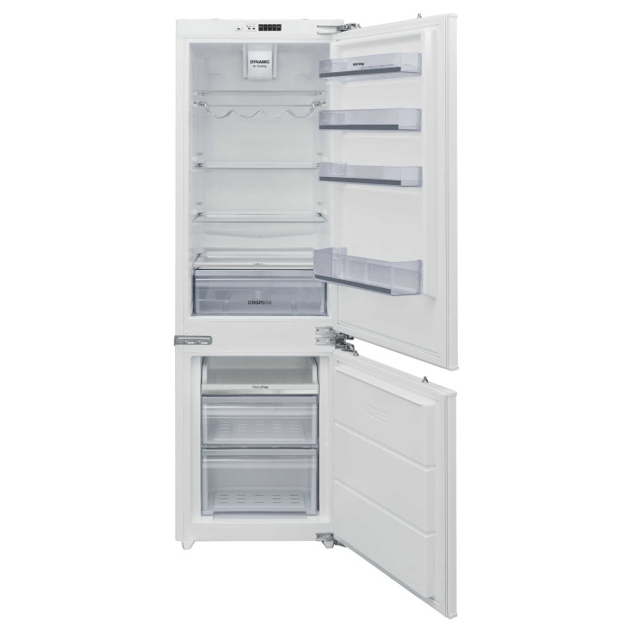 Встраиваемый холодильник-морозильник с функцией No Frost морозильного отделения, Класс энергопотребления: A+, электронное управление с LED индикацией, Режим Быстрого охлаждения, Динамическое охлаждение Dynamic Air Cooling, стеклянные полки в х/о и м/о, ящик для овощей и фруктов CrispBox c регулировкой влажности, металлическая полка для бутылок, Выдвижная полка Sliding Tray в м/о, LED освещение х/о, количество компрессоров: 1, автоматическое размораживание м/о, Перенавешиваемые двери, жесткое крепление, Объем нетто холодильного отделения, л: 180, Объем нетто морозильного отделения, л: 63, Габаритные размеры (в/ш/г), мм: 1770/540/545.