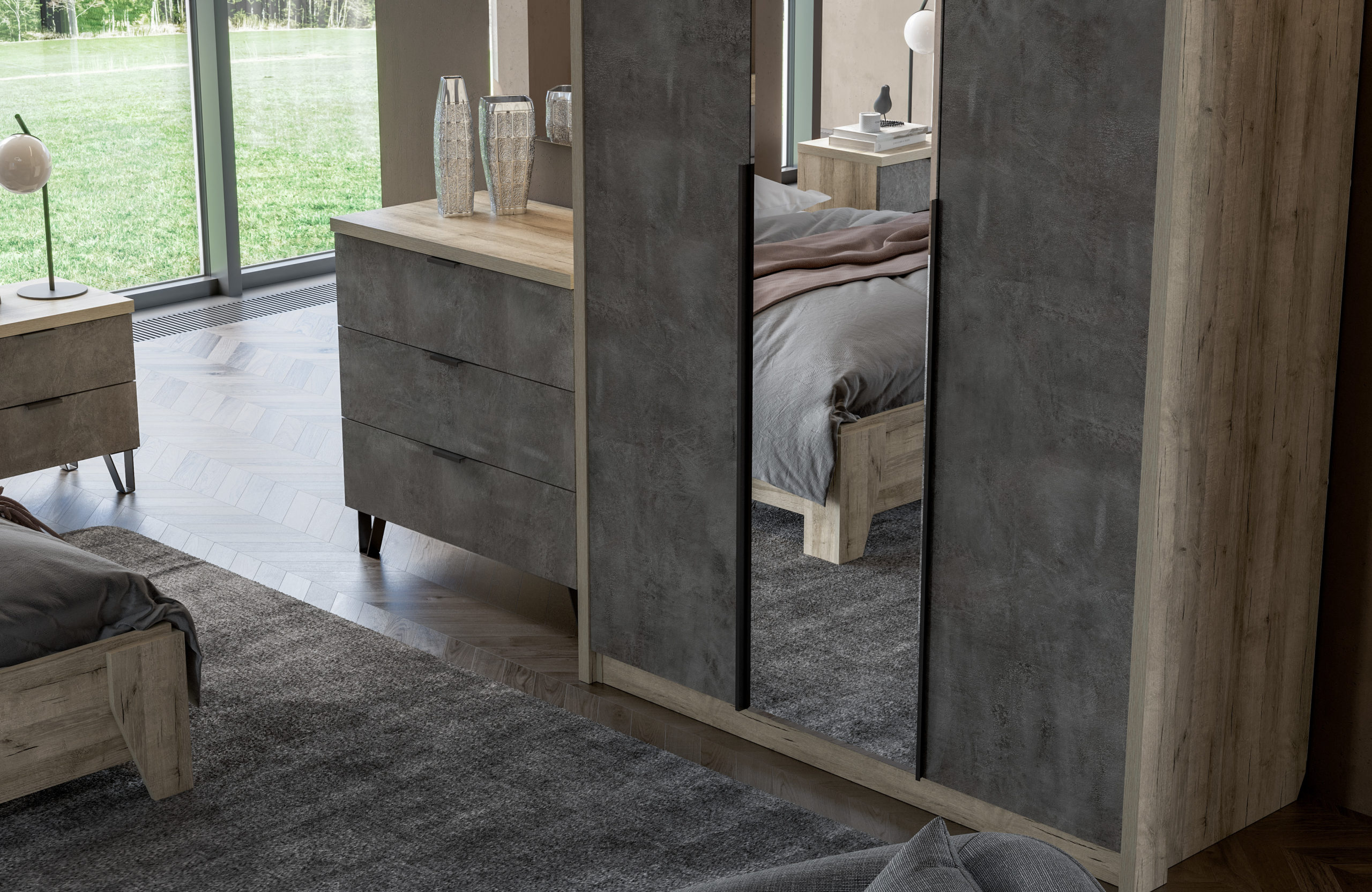 Комод КМ-3201 Анима – самый простой и компактный в модульной спальне Анима. Расцветки такие же, как и у всей модульной спальни – природные текстуры дерева и камня.
