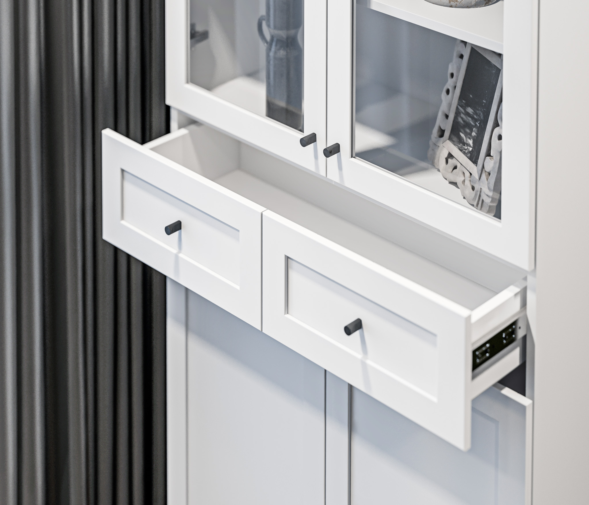 МС Твин предоставляет возможность собрать шкаф или стеллаж по своему вкусу. Вы сами выбираете размеры, цвет ручек: белый или черный, наполнение: ящик или полки. Помимо этого, вы можете решить, оставить фасады глухими или выбрать стеклянные, чтобы добавить прозрачности и легкости в ваш интерьер. Создайте шкаф-стеллаж, который идеально подходит для ваших потребностей и вписывается в ваш стиль.
