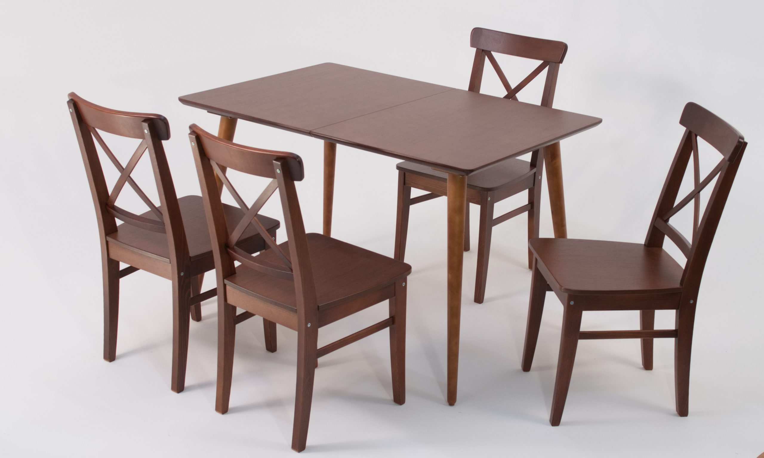 Опоры выполнены из натурального дерева высокой плотности — берёзы. В этой коллекции столешницы выпускаются в нескольких вариантах -МДФ со шпоном и натуральными оттенками, либо МДФ с покрытием эмалью (производство — Италия).