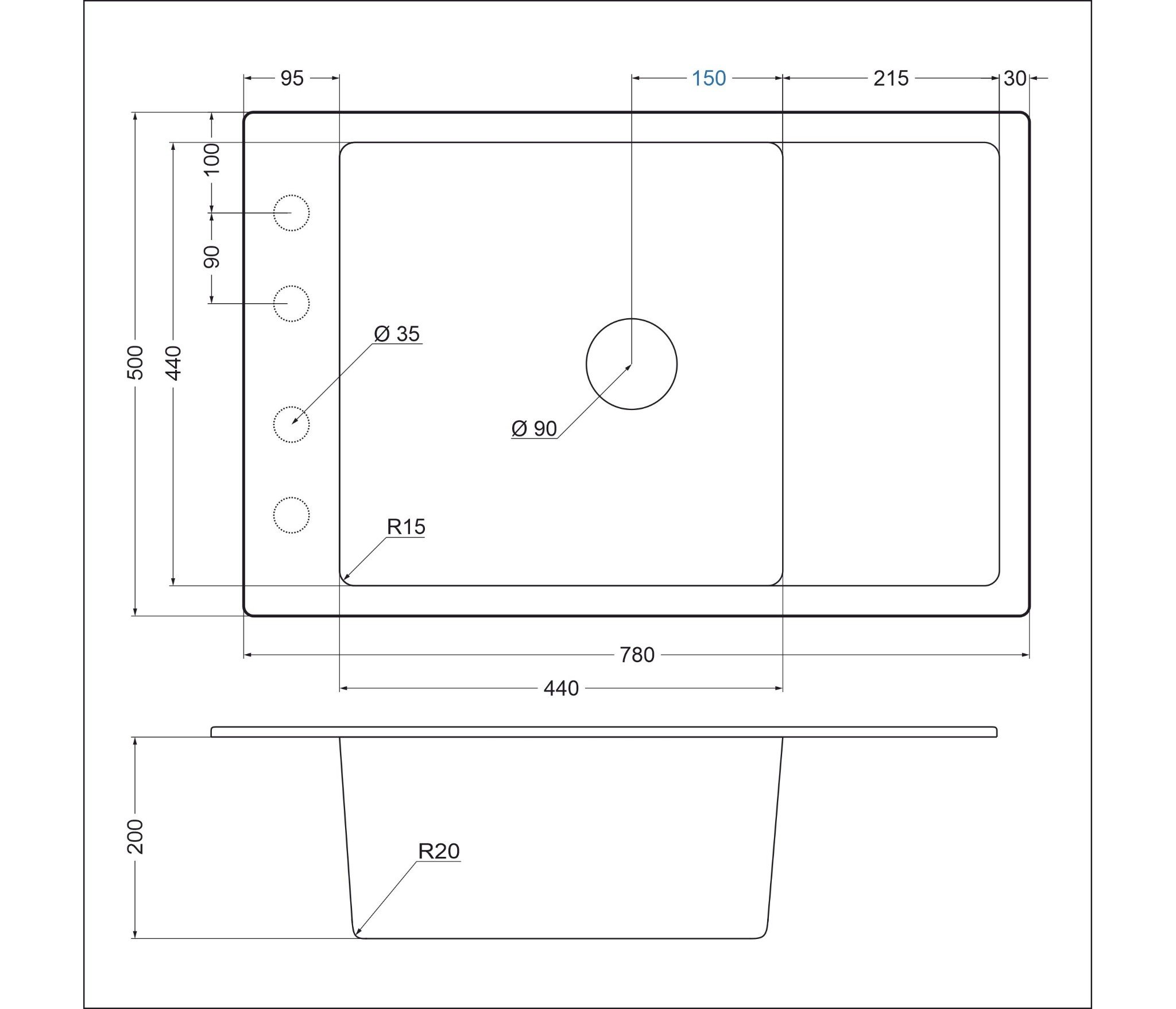 • Размеры мойки: 780 x 500 х 200мм