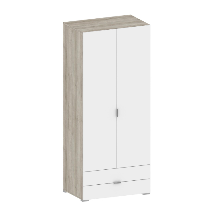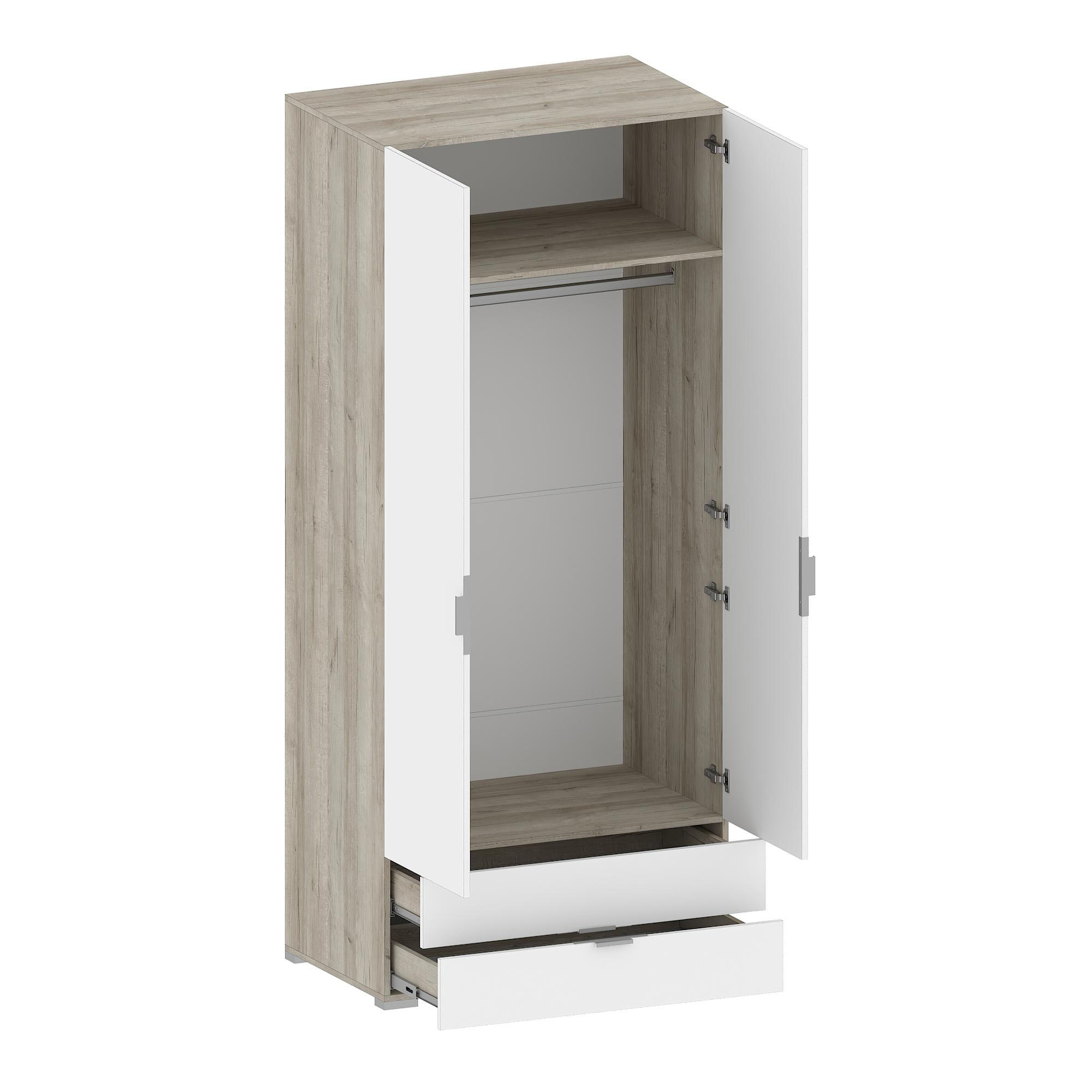 Прямой светлый распашной шкаф имеет две двери (две глухих) и два выдвижных ящика с использованием механизма полного выдвижения и плавного закрывания, дно ящика выполнено из ЛДВП в цвет корпуса.