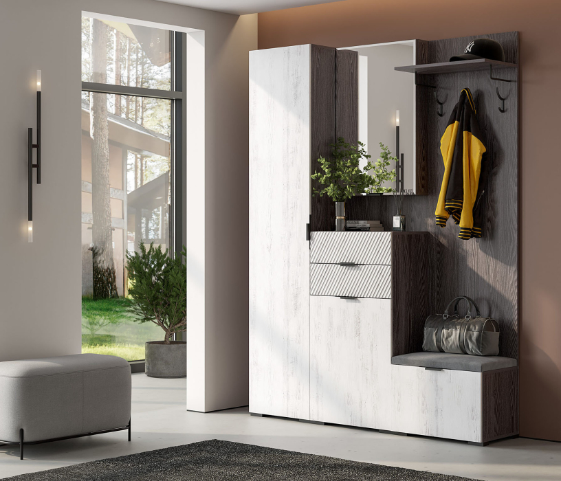Шкаф-прихожая Шаде ШК-3442 имеет тумбу с двумя ящиками и полки с зеркалом.