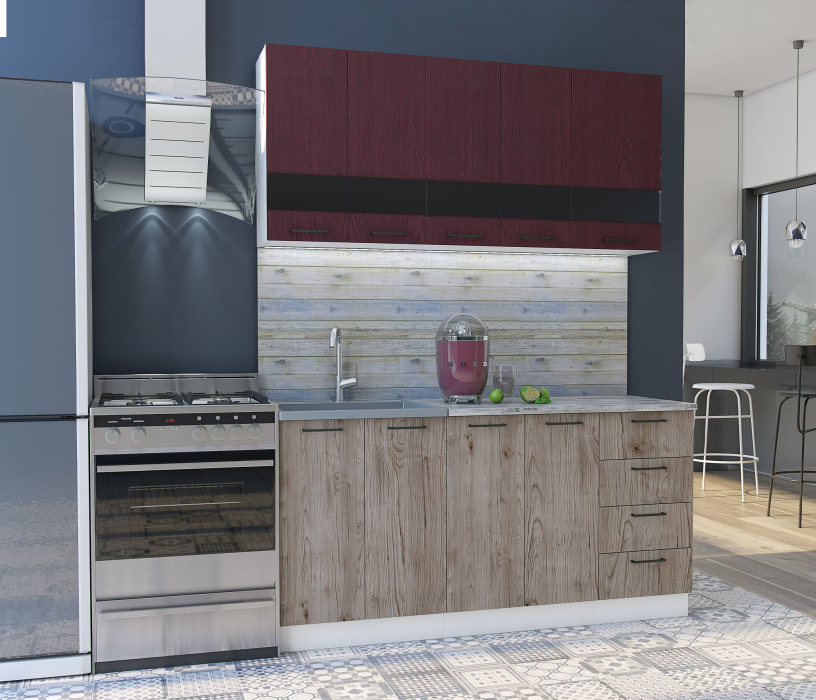 Кухонный гарнитур Астра длиной 1,6 метра подойдёт как для малогабаритной кухни, дачи, так и для небольшой кухни-гостиной. Кухня выполнена в стиле модерн и органично впишется в современный интерьер. Верхние фасады в цвете насыщенного бордо символизируют власть и силу, целеустремленность и уверенность. Нижние фасады с текстурой благородного дуба дополнят смелую кухню брутальностью. Распашные шкафы и выдвижные ящики вместят всю необходимую посуду, кухонную утварь и продукты. Свободное пространство 1000 х 600 мм позволит вам с легкостью готовить даже сложные и много компонентные блюда.